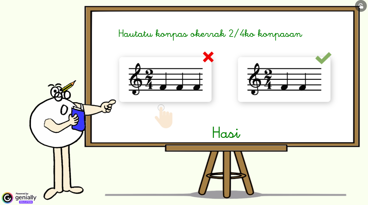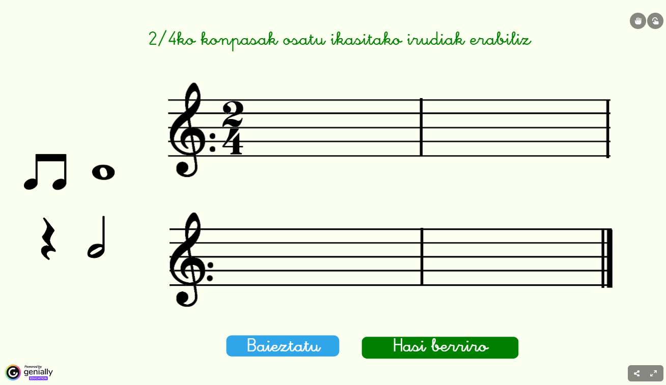 Hemen dituzu 2/4ko konpasa lantzeko ariketa batzuk. Atal batean, irudiak pentagramara eraman beharko dituzu, konpas bat osatzeko. Bestean, audio bat