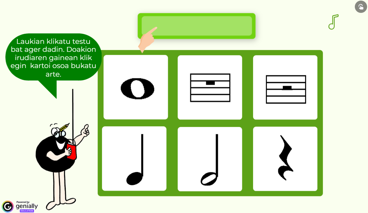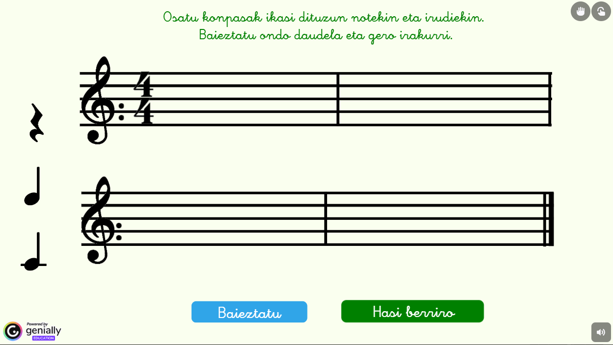 Hemen dituzu 2/4ko konpasa lantzeko ariketa batzuk. Atal batean, irudiak pentagramara eraman beharko dituzu, konpas bat osatzeko. Bestean, audio bat